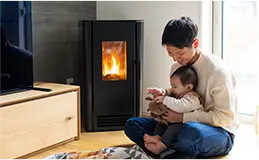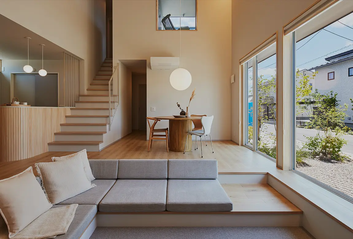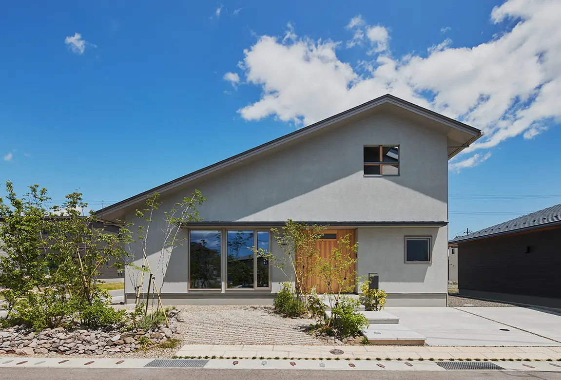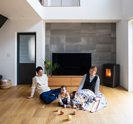 どこにいても家族の様子がよく見える、明るくてあたたかい家になりました。もともと夫婦そろってアウトドアが好きだったので、炎のゆらめきを眺められるペレットストーブを採用。打ち合わせの時から年の近い担当者の皆さんと気兼ねなくお話でき、非常に満足度の高い家づくりになりました。 -