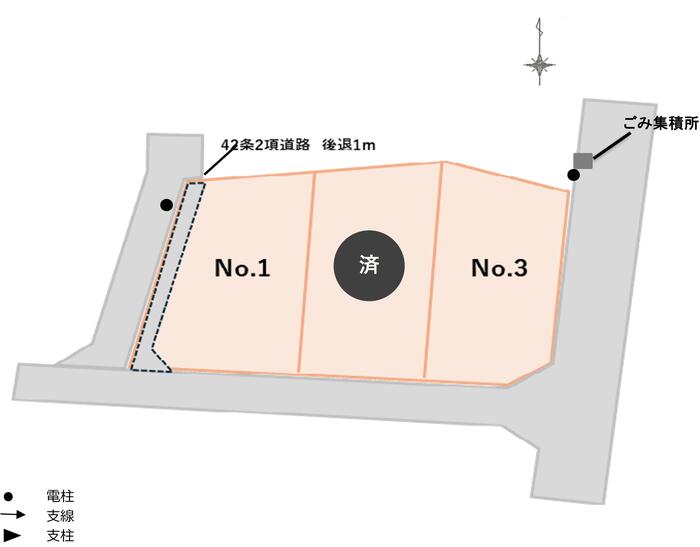 | その他 | ・No.3の東南角の路面に圓光寺の誘導看板あり ・No.1の西側道路は道路後退必要(道路後退用地:21.07㎡ 6.37坪) ・設備:公営水道、公共下水、都市ガス(前面道路埋設)、東北電力 |