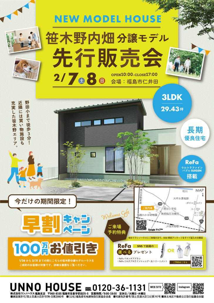 ※笹木野モデルハウスは建築中のため、会場は仁井田のモデルハウスとなります。