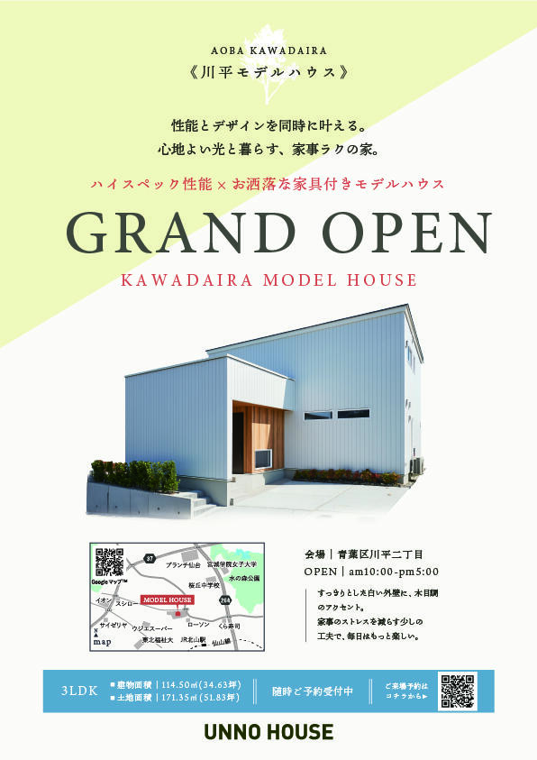 青葉区川平の大型分譲地内にて性能×家事ラク×デザインにこだわったモデルハウスがGRAND OPEN!